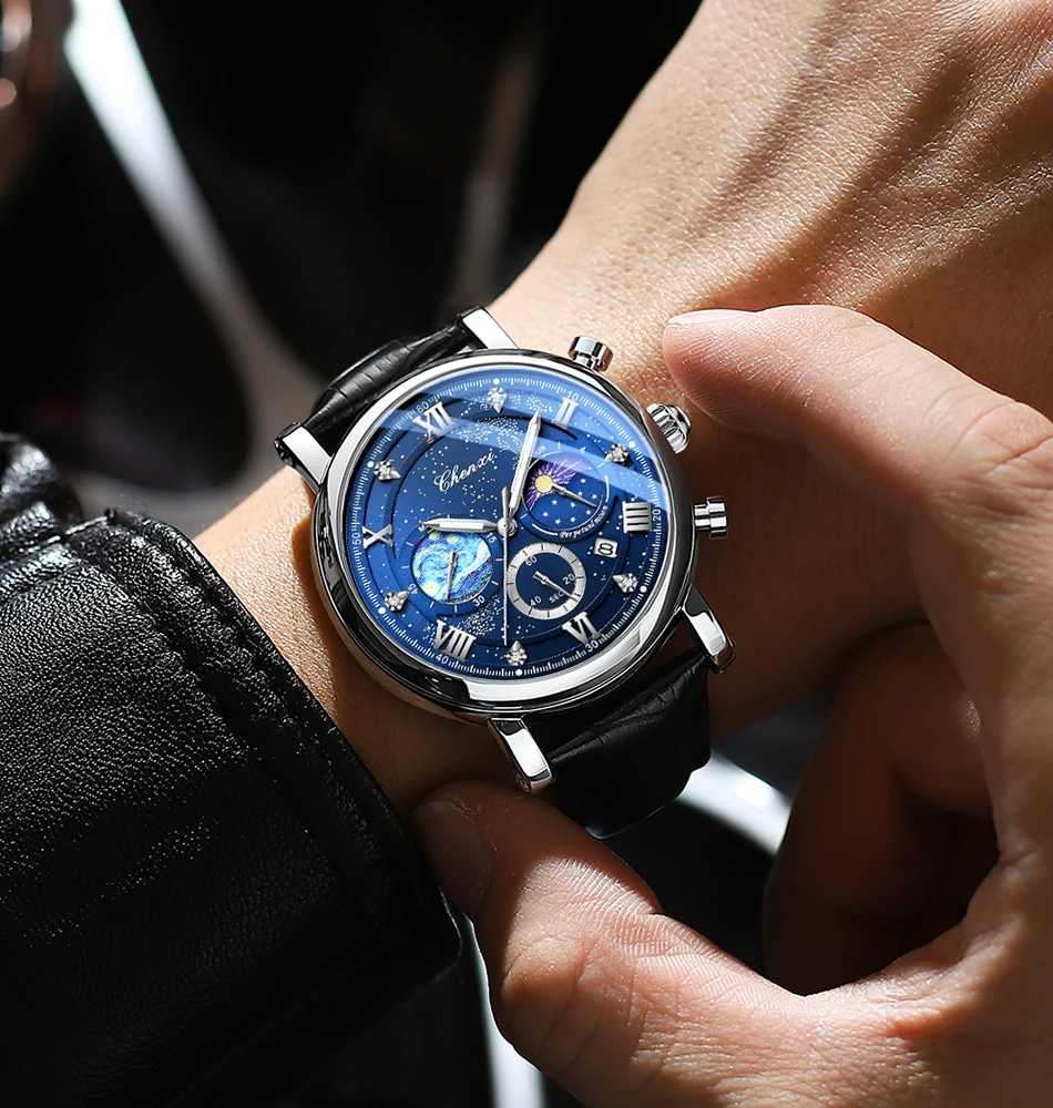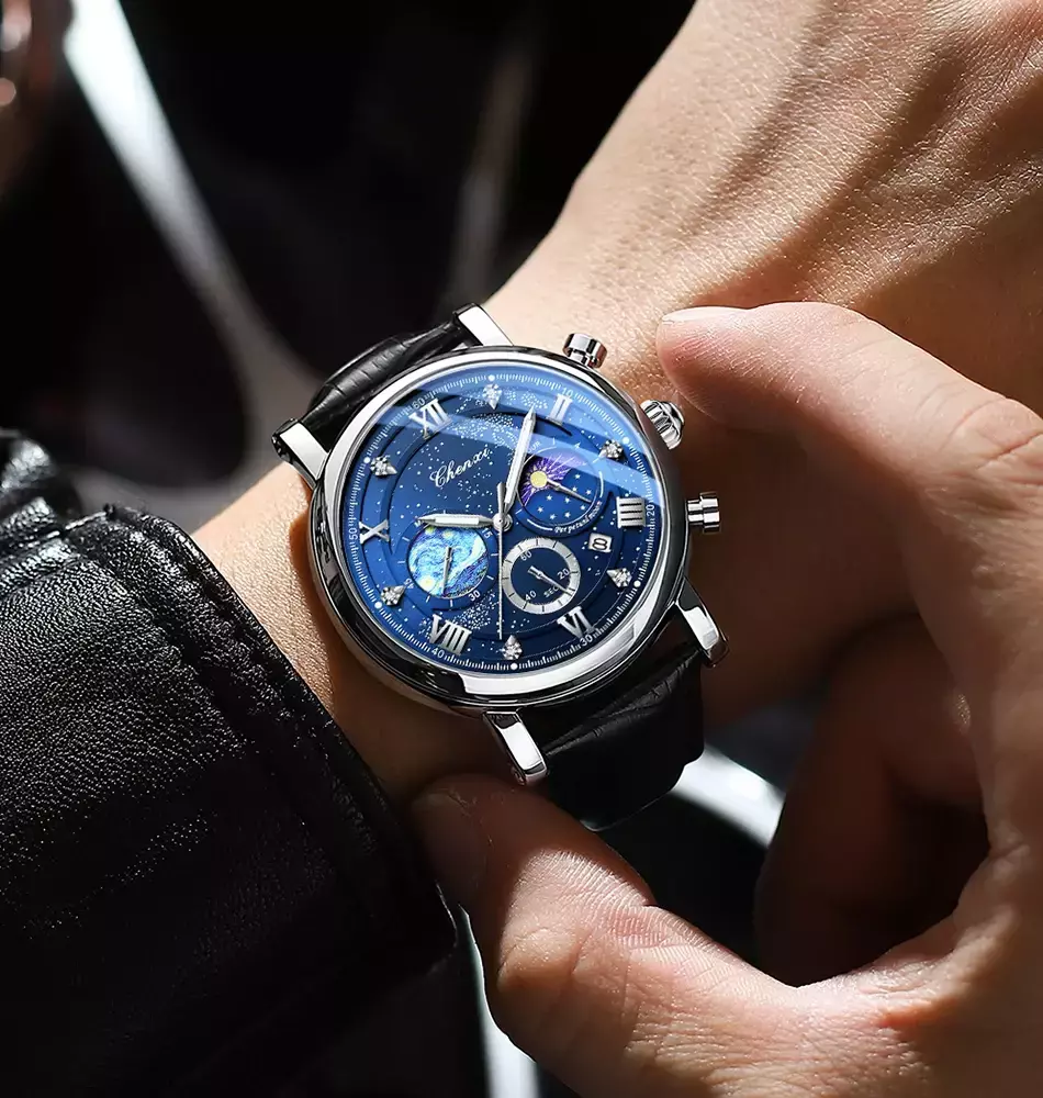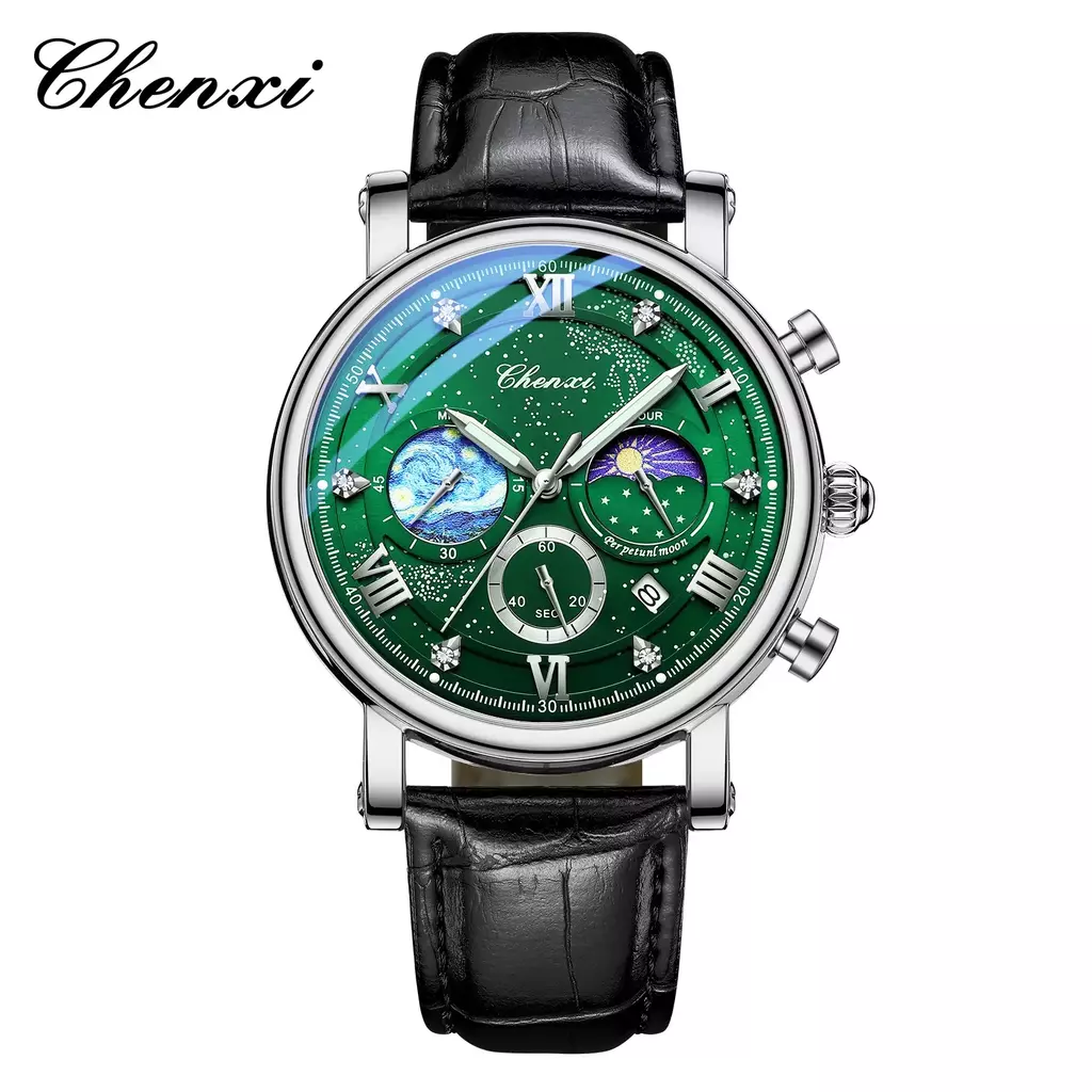 O Relógio Chenxi Masculino combina design sofisticado com funcionalidades modernas. Com pulseira de couro legítimo, mostrador elegante e funções avançadas como cronógrafo, calendário completo e fase da lua, ele é a escolha perfeita para homens que valorizam estilo e praticidade no dia a dia.