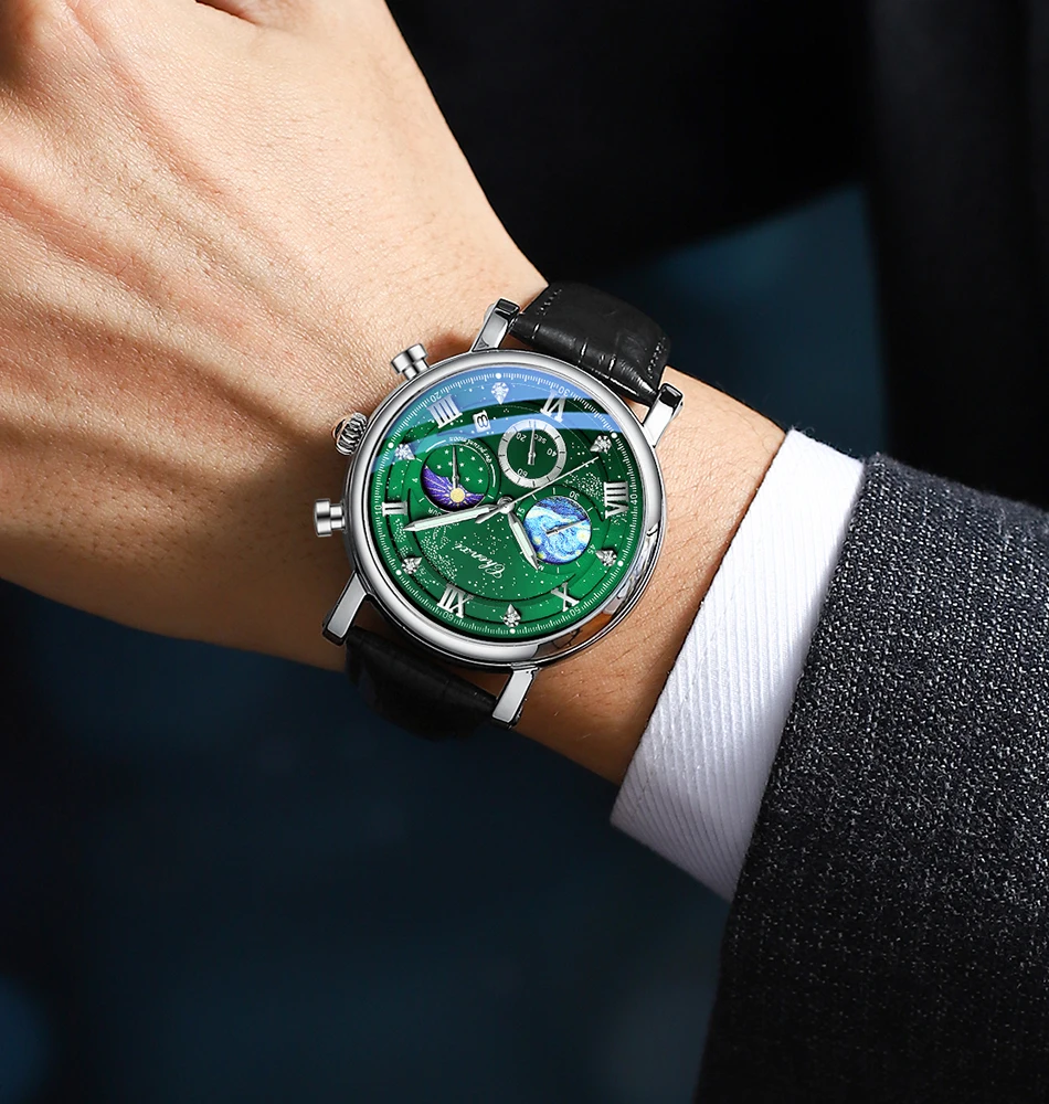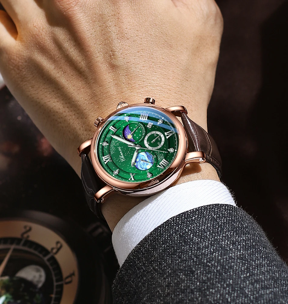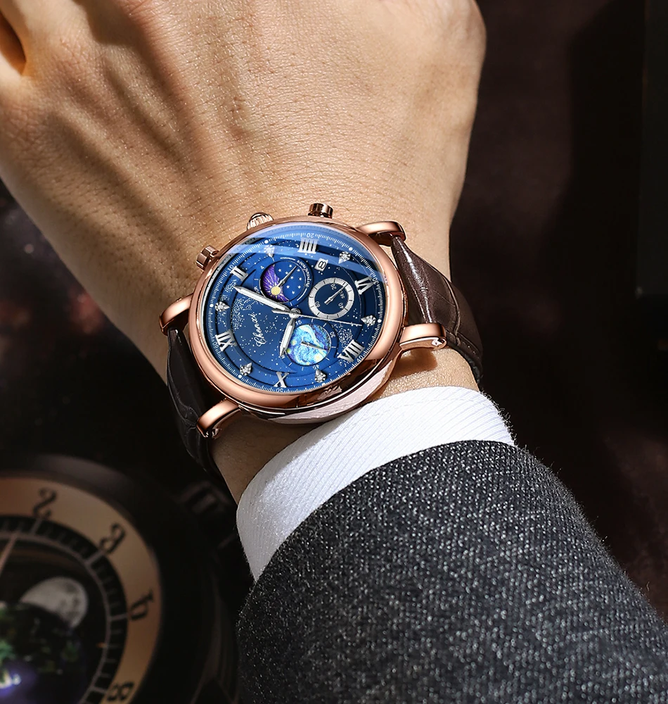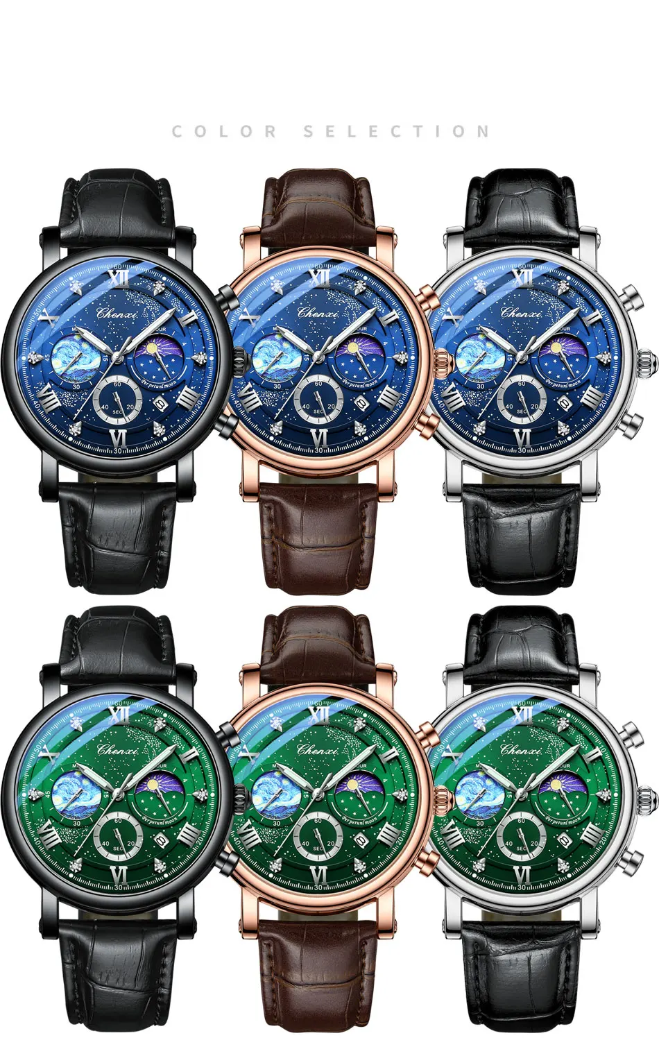 O Relógio Chenxi Masculino combina design sofisticado com funcionalidades modernas. Com pulseira de couro legítimo, mostrador elegante e funções avançadas como cronógrafo, calendário completo e fase da lua, ele é a escolha perfeita para homens que valorizam estilo e praticidade no dia a dia.
